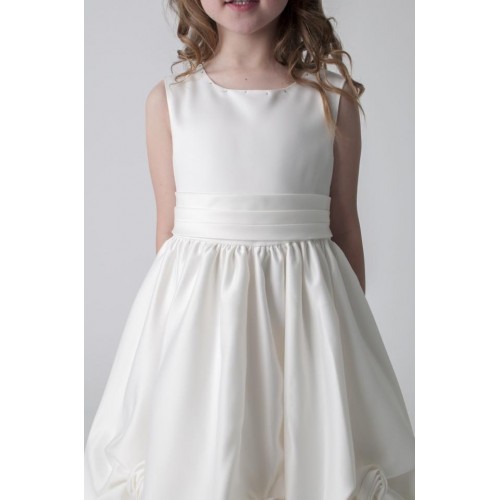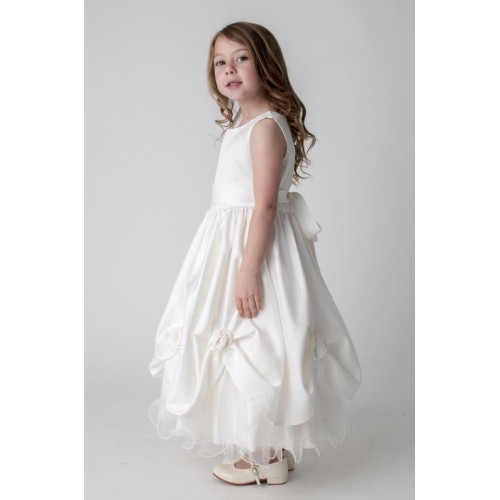 This beautiful dress features a ivory satin sash and ivory rosebuds around the hemline. Satin and tulle.