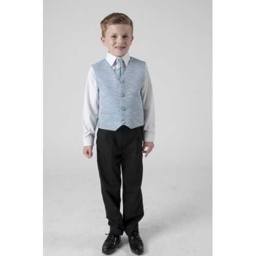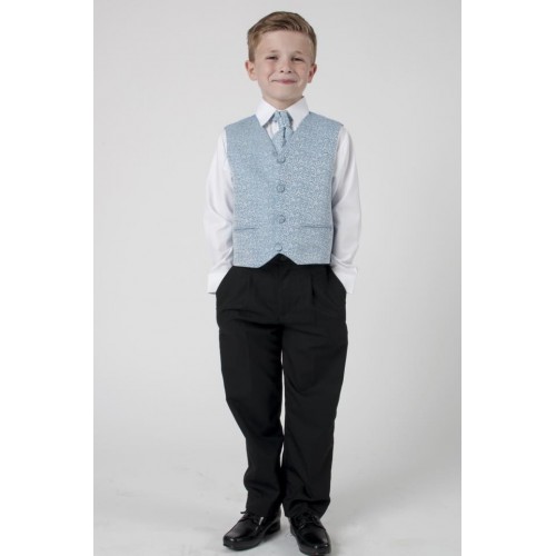 This suit features elasticated black trousers and a full sleeve white shirt. The waistcoat has a swirled stitch pattern detailing and a silver