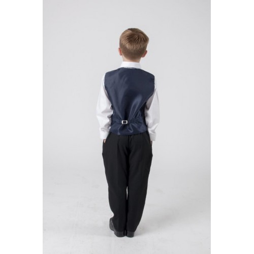 This suit features elasticated black trousers and a full sleeve white shirt. The waistcoat has a swirled stitch pattern detailing and a silver clasp at the back for size alterations. The suit also comes with an elasticated matching cravat as an elegant finishing touch.