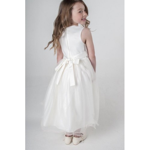 This beautiful dress features an ivory satin sash with a single rose in the middle, around the waist. Satin and tulle.